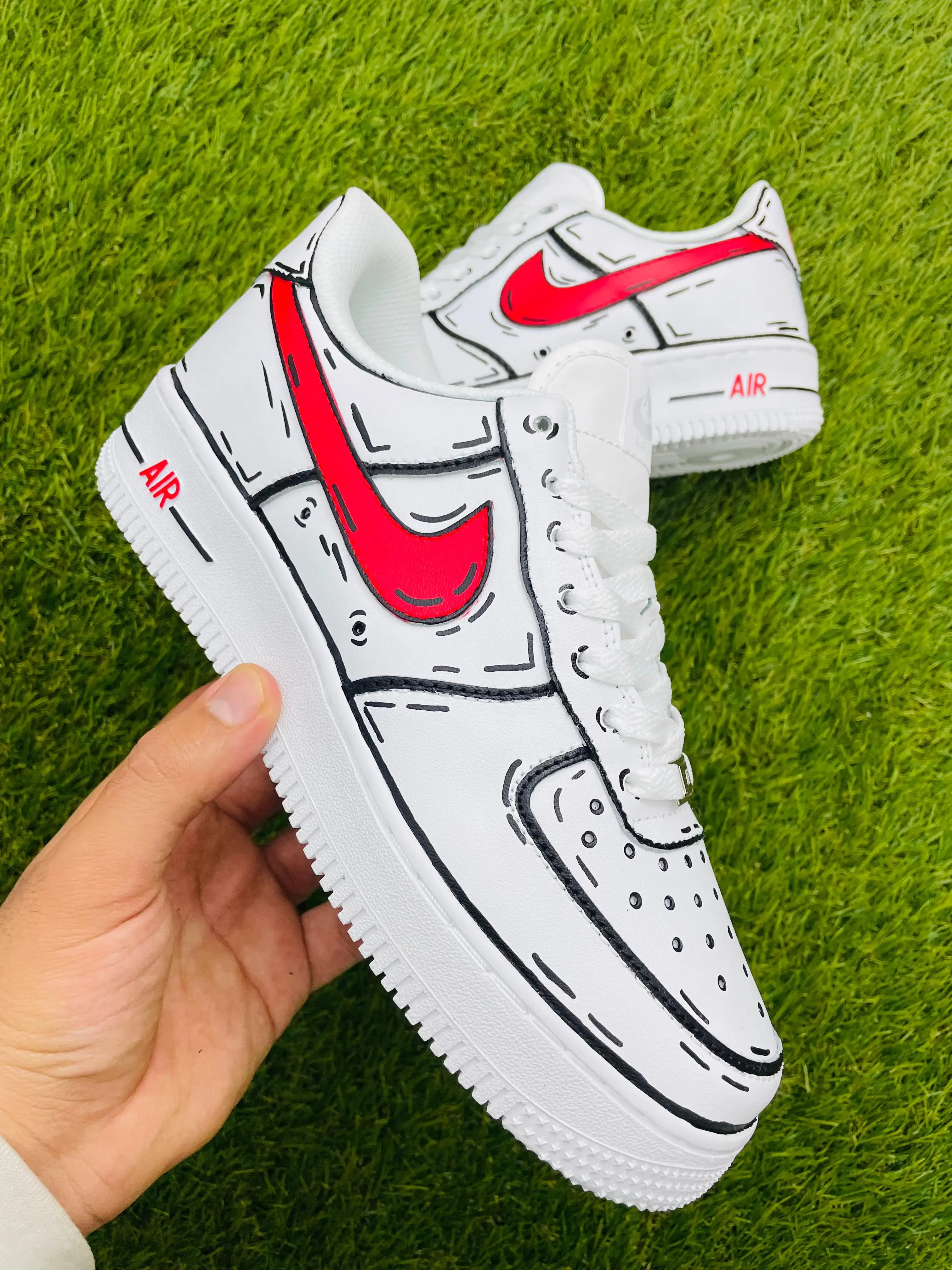 Bring your sneakers to life with these Cartoon Style Custom Nike Air Force 1 sneakers. Designed and hand-painted by the artists at JadoreArt LLC, these shoes feature bold black comic outlines and a striking red Nike swoosh, giving them a 2D cartoon effect that pops in real life.