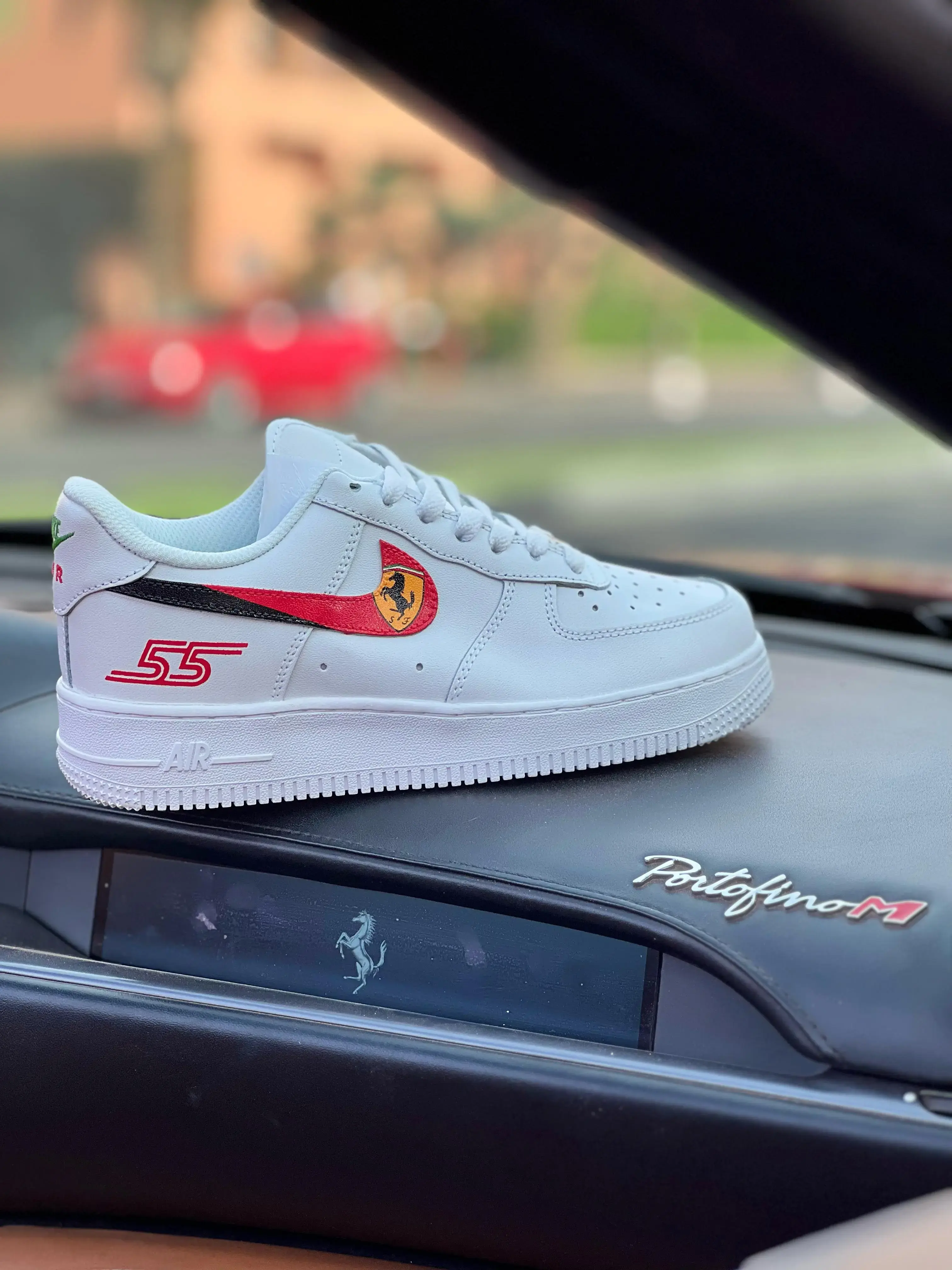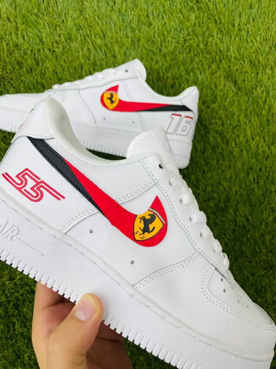 Fuel your passion for speed and style with these Ferrari F1 Custom Nike Air Force 1 sneakers. Each pair is hand-painted by skilled artists at JadoreArt LLC, showcasing the Scuderia Ferrari logo and the race numbers 16 (Charles Leclerc) and 55 (Carlos Sainz).