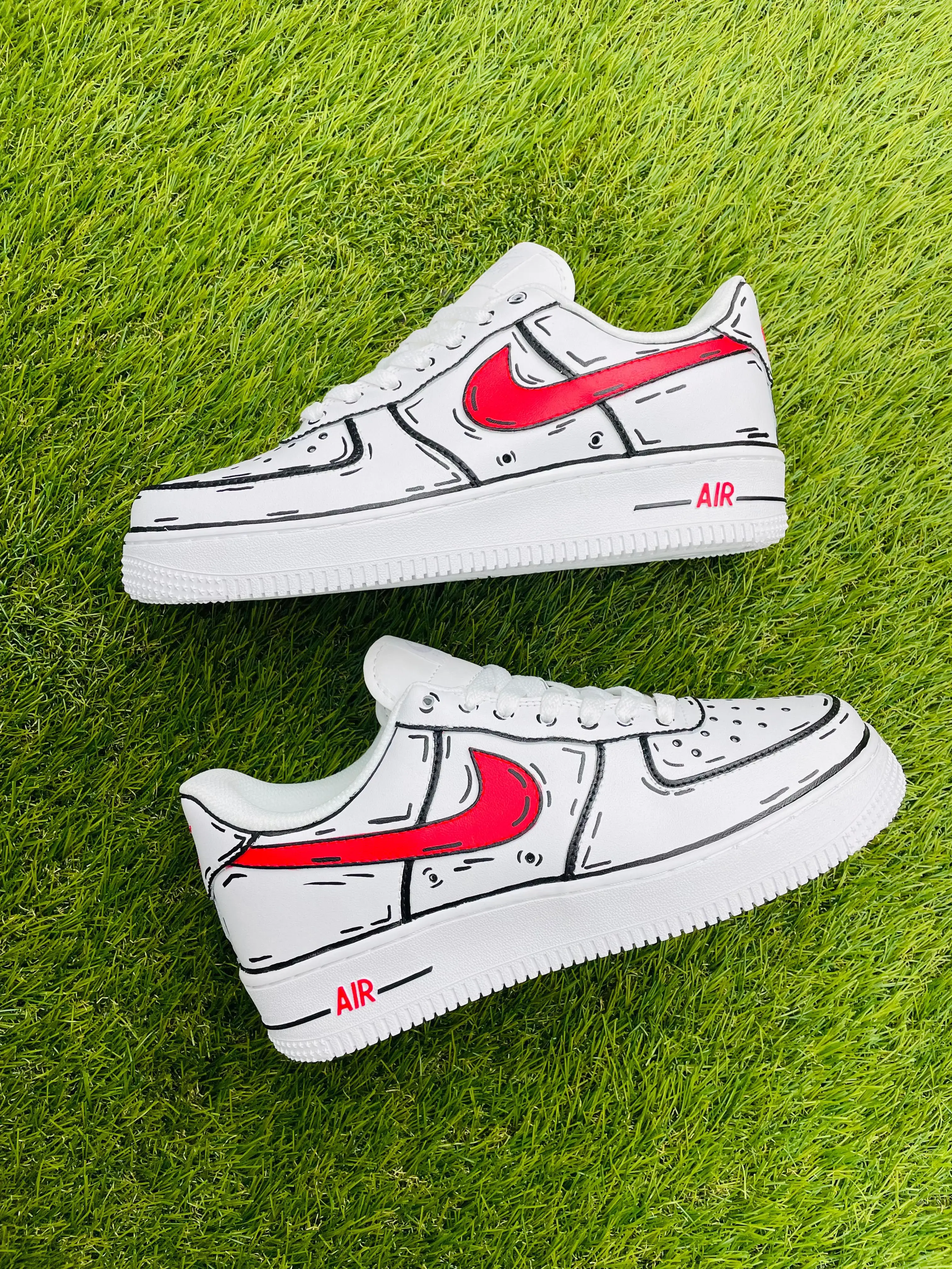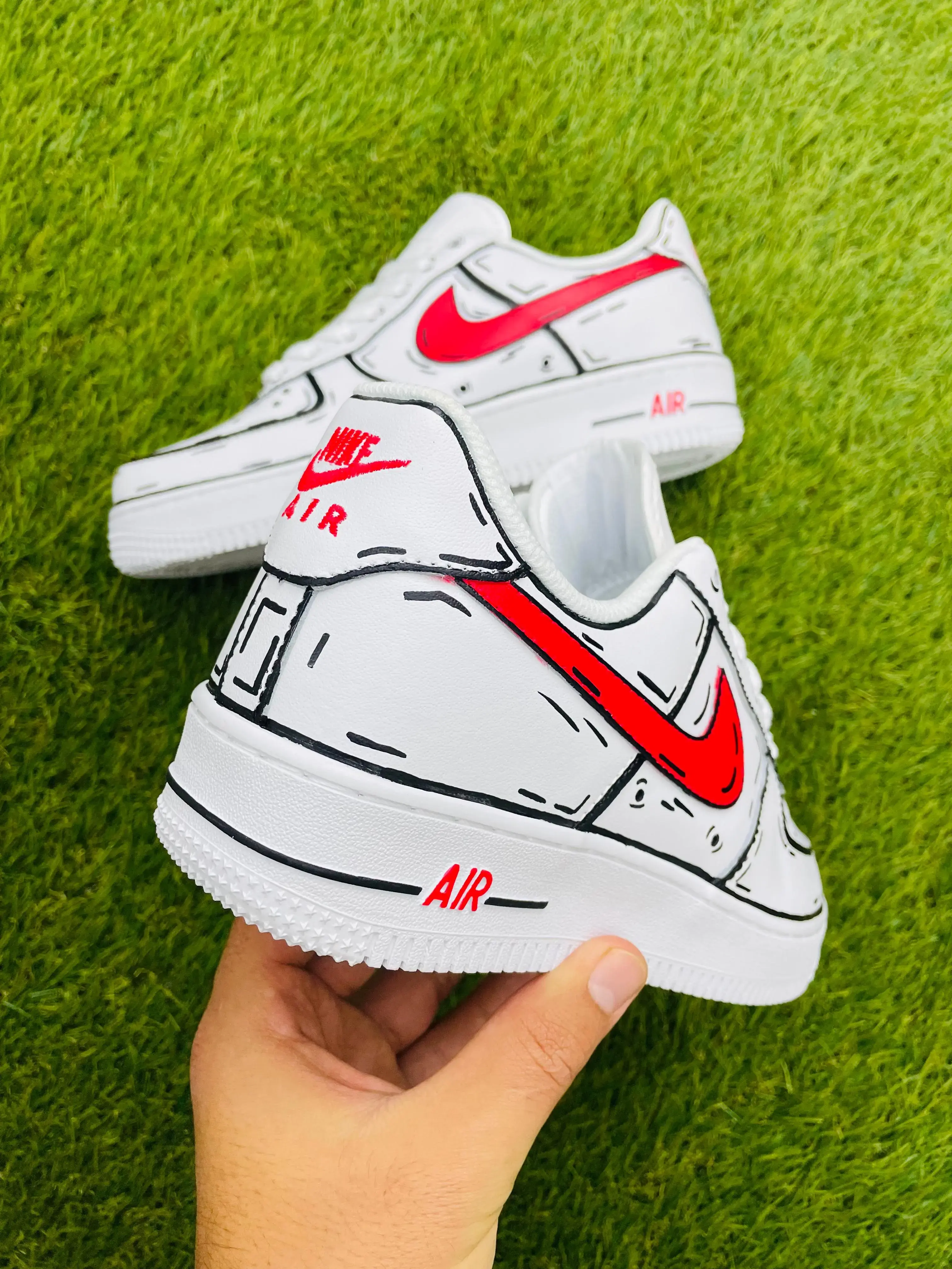 Bring your sneakers to life with these Cartoon Style Custom Nike Air Force 1 sneakers. Designed and hand-painted by the artists at JadoreArt LLC, these shoes feature bold black comic outlines and a striking red Nike swoosh, giving them a 2D cartoon effect that pops in real life.