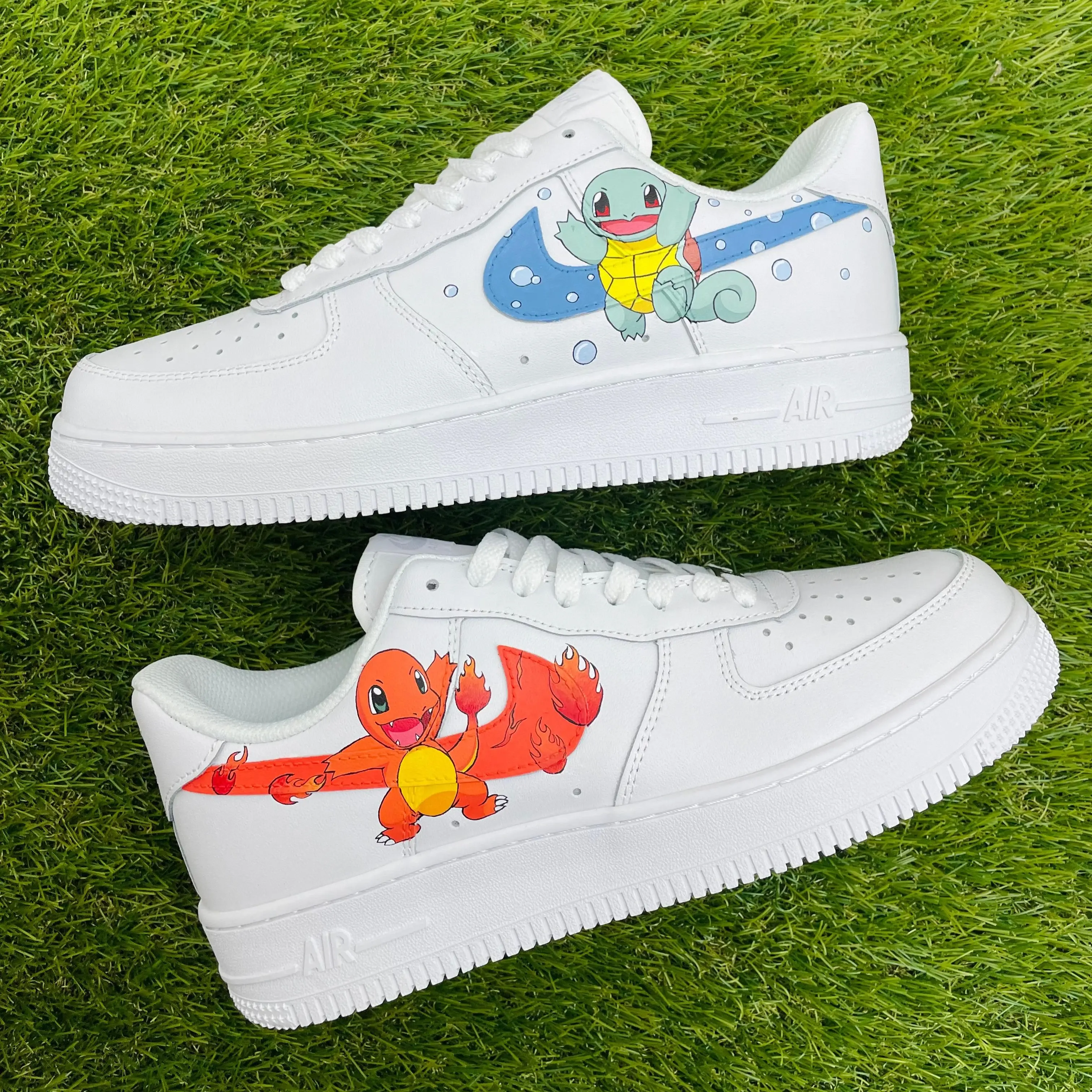 Step out in style with these incredible custom hand-painted Nike Air Force 1 sneakers. Each pair is a unique work of art, featuring the beloved Pokémon starters, Squirtle and Charmander. On one shoe, a vibrant, water-splashing Squirtle is painted on the classic Nike swoosh. The other shoe showcases a fiery Charmander, ready for battle. These sneakers are not just footwear; they are a tribute to the iconic Pokémon franchise. Made with high-quality, durable paint, the intricate details of each character are designed to last. Perfect as a standout piece for your own collection or as a special, handmade gift for a Pokémon fan. Don't miss your chance to own a truly one-of-a-kind pair of Pokémon-themed custom sneakers!