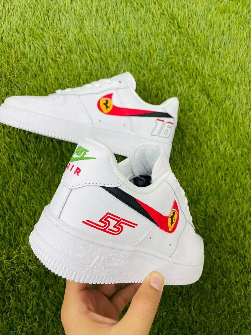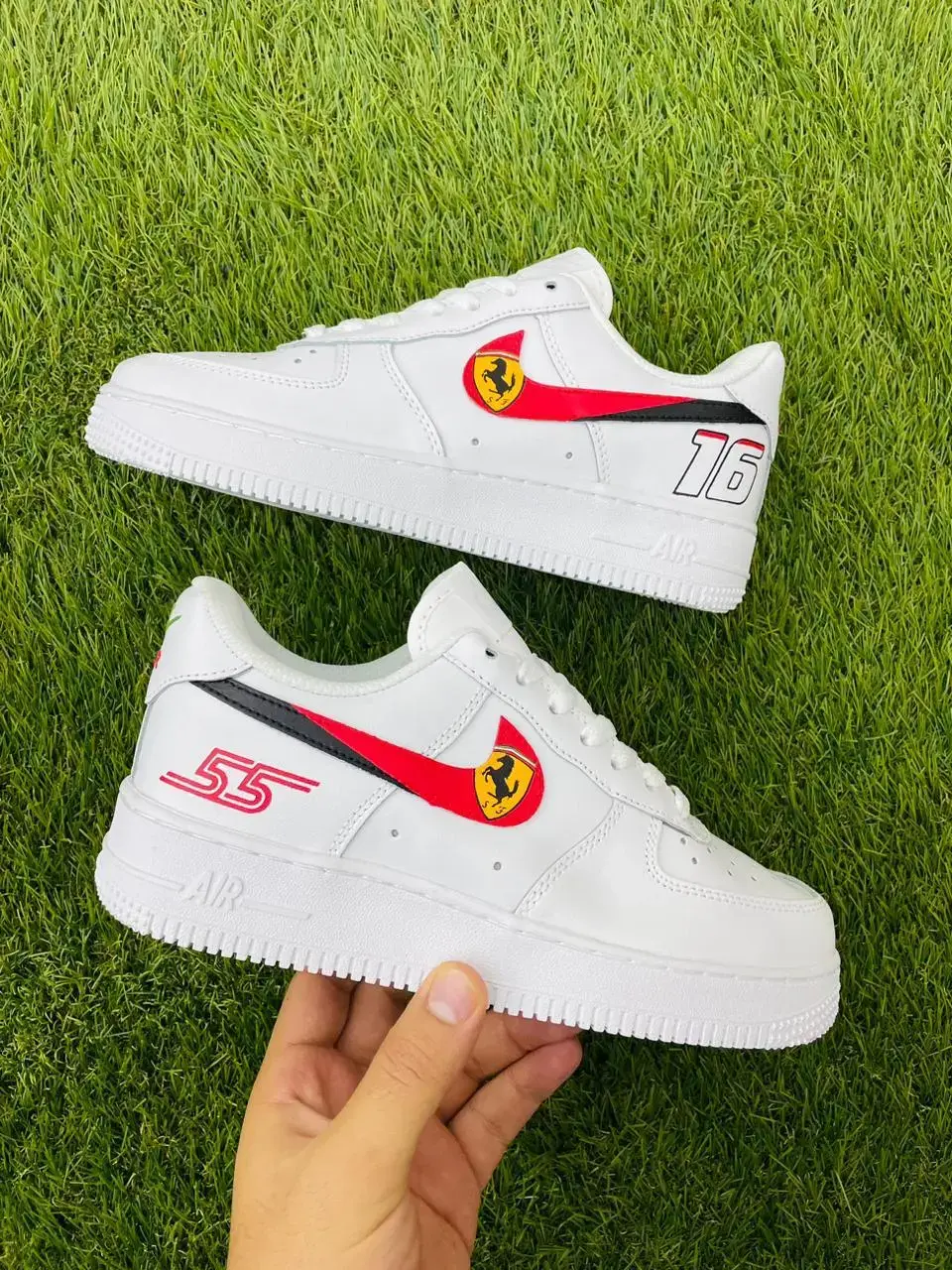 Fuel your passion for speed and style with these Ferrari F1 Custom Nike Air Force 1 sneakers. Each pair is hand-painted by skilled artists at JadoreArt LLC, showcasing the Scuderia Ferrari logo and the race numbers 16 (Charles Leclerc) and 55 (Carlos Sainz).